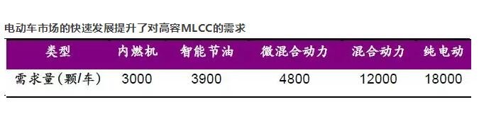 通信频段大幅增加将带来超小型MLCC的需求增量。相比目前满足LTE标准的手机需要的300-500 颗贴片电容 ,到满足LTE-advanced标准的手机需550-900颗,单机MLCC用量将提升80%以上。电动车市场的快速发展提升了对高容MLCC的需求。燃油车不需要使用MLCC,而纯电动车需要使用大约18000个高容MLCC。