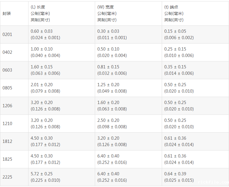 尺寸:例如0402表示长度为0.04英寸、宽度为0.02英寸(或1005表示1.0mm x 0.5mm)。