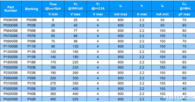 PXXX0SB系列TSS半导体放电气管参数图表如下